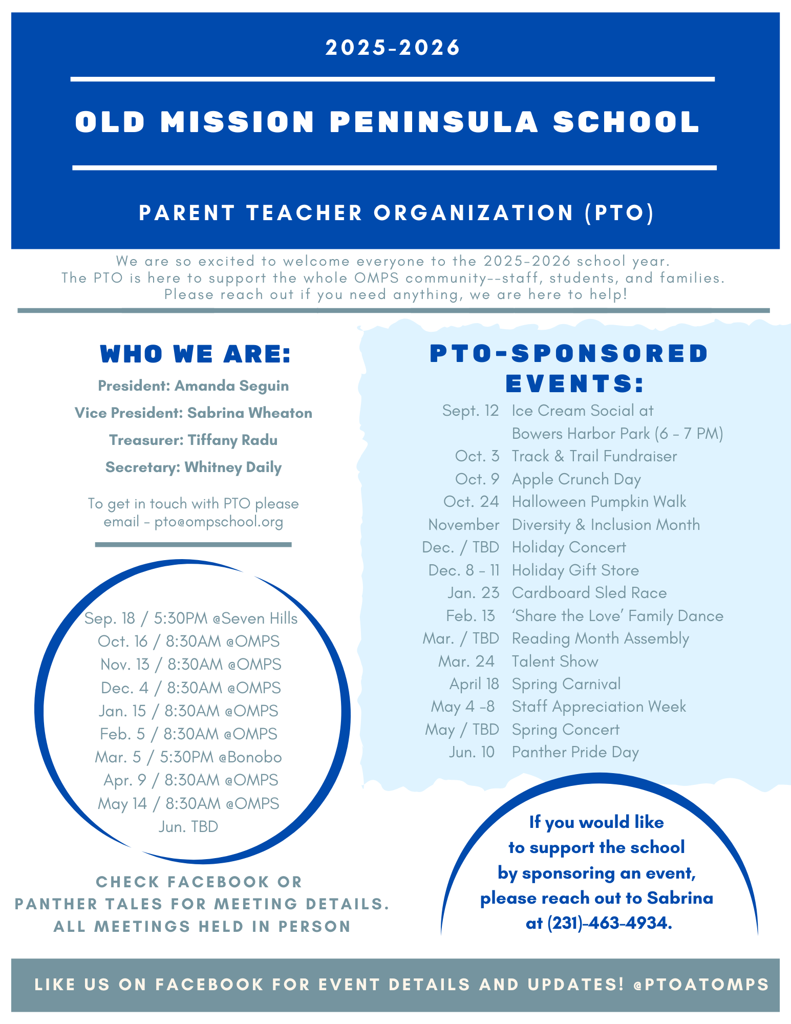 If you would like to sponsor an event, contact Sabrina Wheaton at pto@ompschool.org.